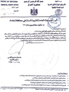أشارت وزارة التربية إلى توجيه كتاب للمديريات في بغداد حول موضوع صرف الرواتب وتجديد العقود لمحاضري بغداد 2020 فيما لفتت وثيقة إلى توجيه وزارة التربية كتاباً للمديريات في بغداد حول موضوع صرف الرواتب وتجديد العقود لمحاضري بغداد 2020.
