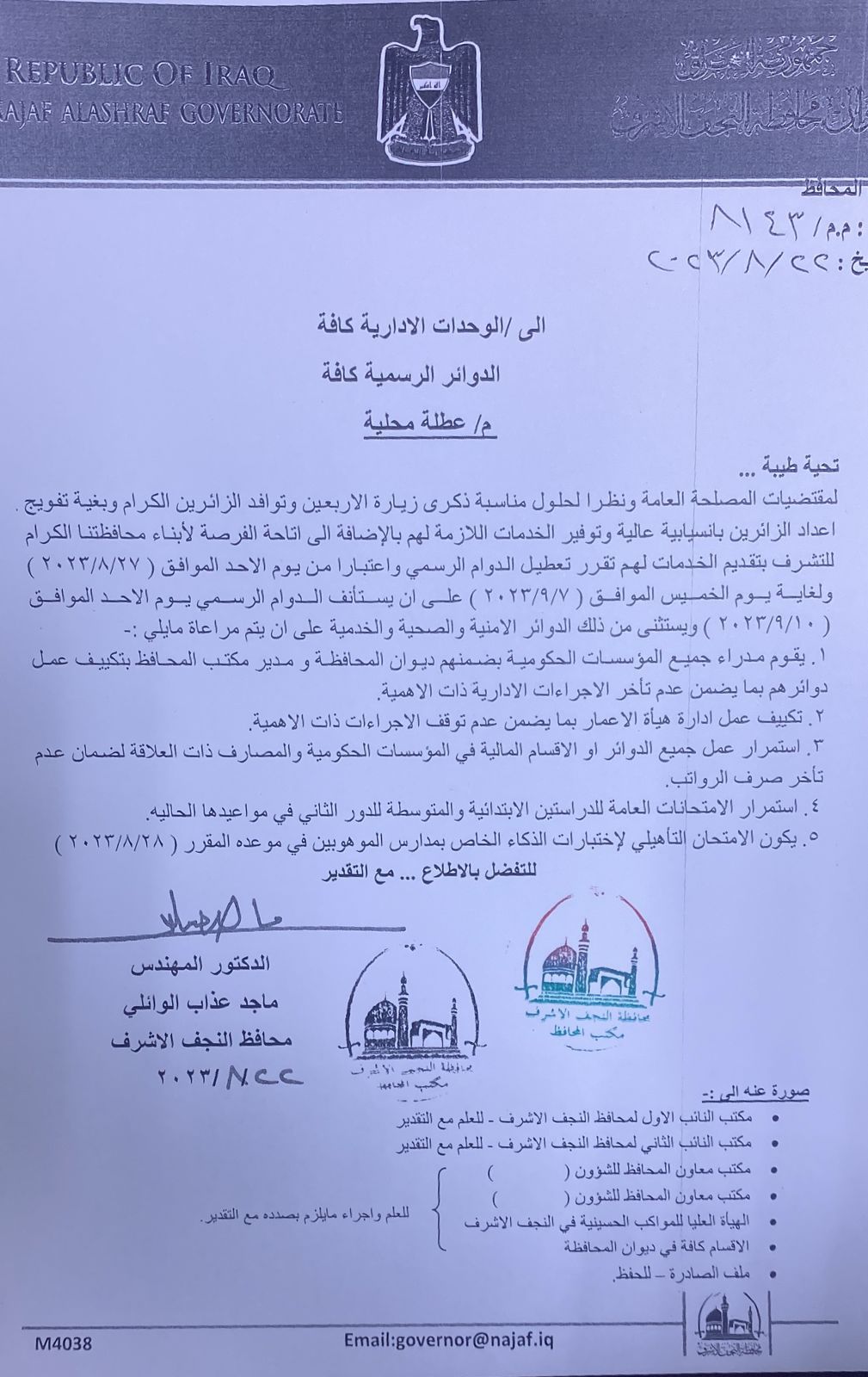 وبحسب وثيقة صادرة عن ديوان محافظة النجف، فإن “العطلة تبدأ من 8/27 ولغاية 9/7، وذلك لإتاحة المجال لأبناء المدينة لخدمة زائري الأربعين”.