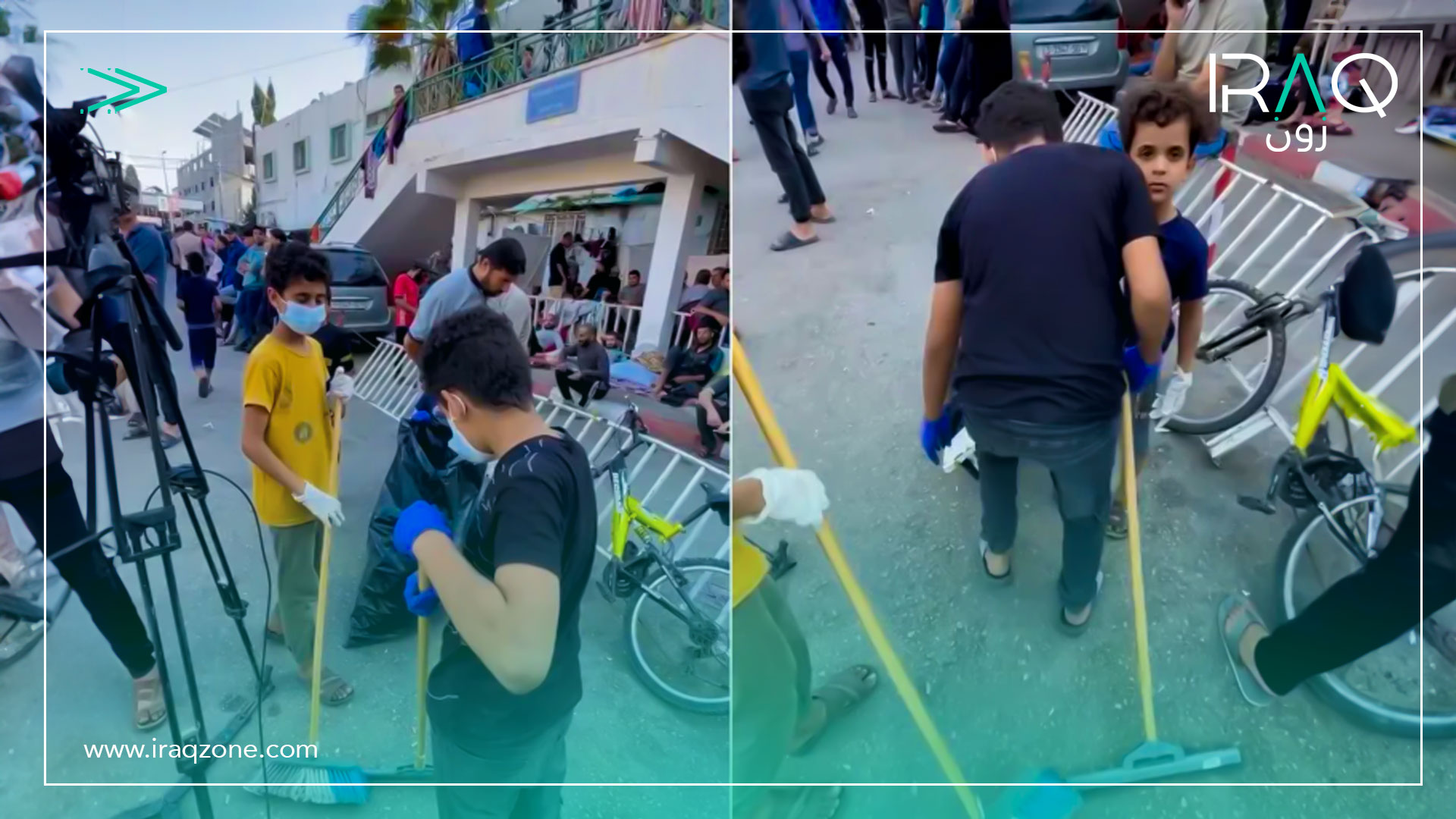 رغم القصف.. أطفال يتطوعون لتنظيف الشارع أمام مجمع الشفاء بغزة