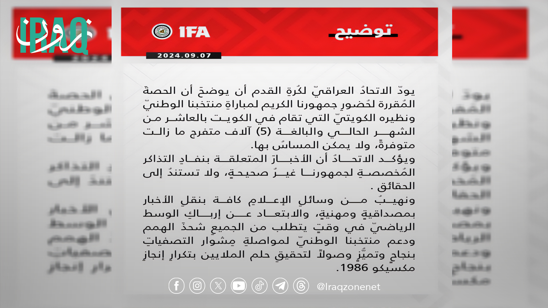 أصدر الاتحاد العراقي لكرة القدم بياناً قال فيه: أن الاتحادُ العراقيّ لكُرةِ القدم يود أن يوضحَ أن الحصةَ المُقررة لحُضورِ جمهورنا الكريم لمباراةِ منتخبنا الوطنيّ ونظيره الكويتيّ التي تقام في الكويت بالعاشر من الشهر الحالي والبالغة (5) آلاف متفرج ما زالت متوفرةً، ولا يمكن المساسُ...